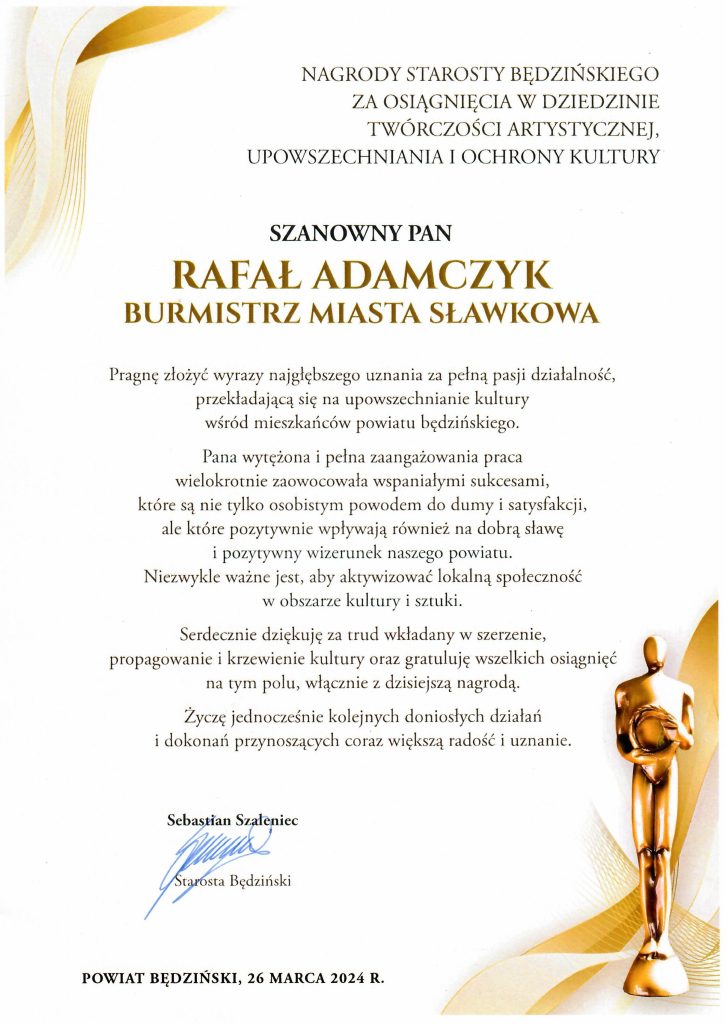 Uzyskanie Nagrody Starosty Będzińskiego za Osiągnięcia w Dziedzinie Twórczości Artystycznej, Upowszechniania i Ochrony Kultury.