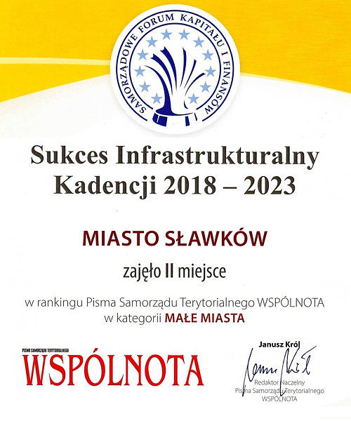 Sławków zdobył II miejsce! To, że zmieniamy Sławków jest doskonale widoczne w ilości zrealizowanych inwestycji w ostatnich latach. Ale dopiero porównanie naszej pracy z innymi samorządami wskazuje dynamikę i skalę naszych działań. Tegoroczny ogólnopolski ranking samorządowego czasopisma Wspólnota w kategorii „Infrastrukturalny Sukces Kadencji 2018–2023” pokazuje, że jesteśmy wśród liderów zmian! Znajdujemy się bowiem na 2