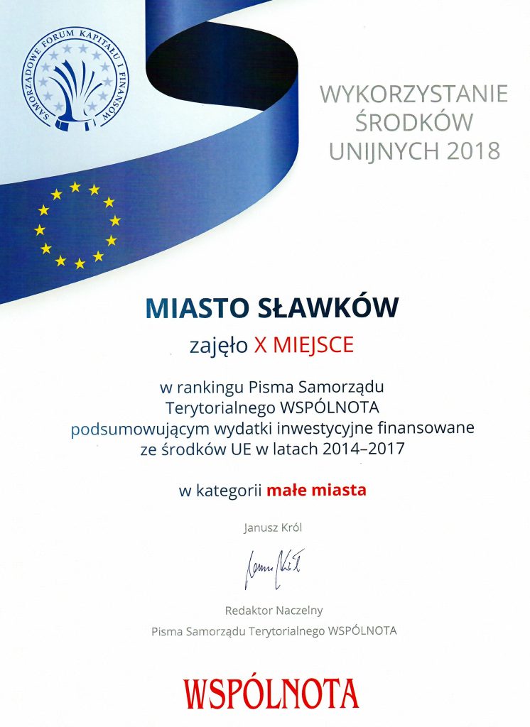 10 miejsce Sławkowa w rankingu wykorzystania środków unijnych w kategorii polskich małych miast opracowanym przez Pismo Samorządu Terytorialnego „Wspólnota”.