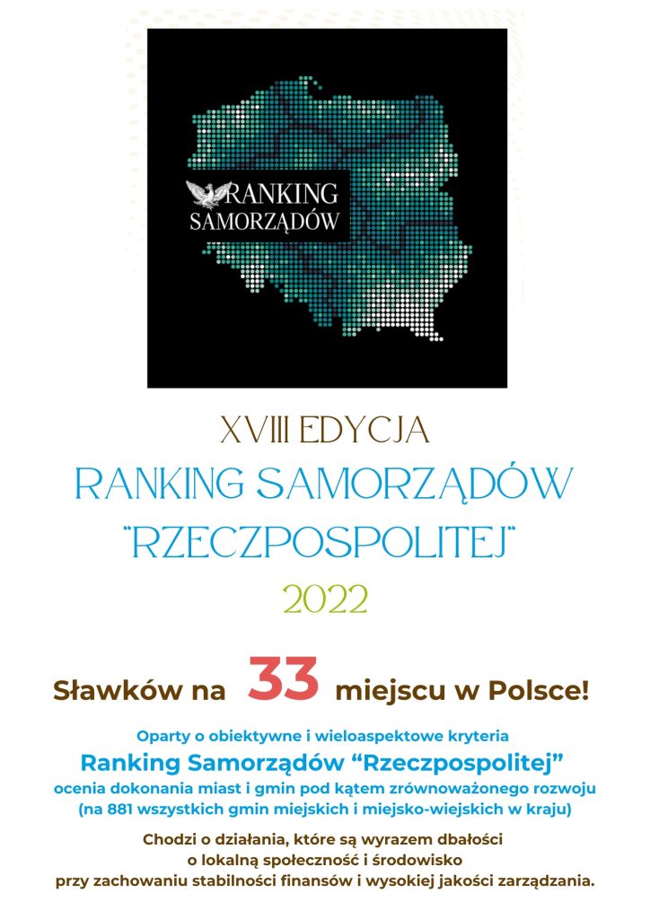 33 miejsce Sławkowa w rankingu Samorządów „Rzeczpospolitej” w zakresie zrównoważonego zarządzania rozwojem miastem.