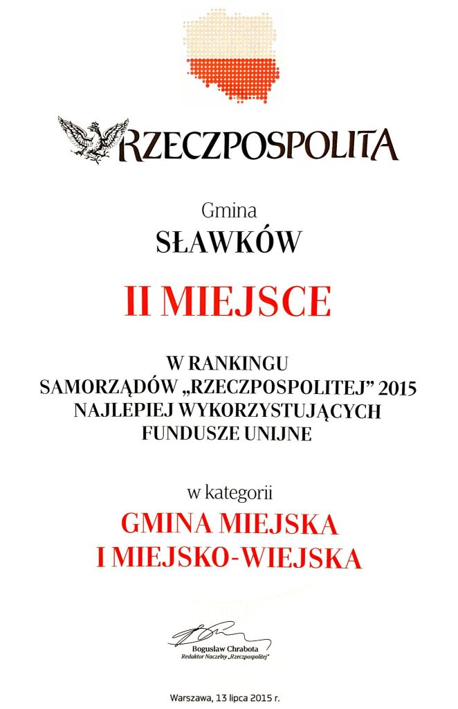 2 miejsce Sławkowa w rankingu Samorządów „Rzeczpospolitej” 2015 najlepiej wykorzystujących fundusze unijne w kategorii gmin miejskich i miejsko-wiejskich.