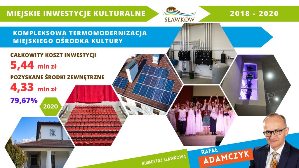 Kompleksowa termomodernizacja Miejskiego Ośrodka Kultury w Sławkowie.