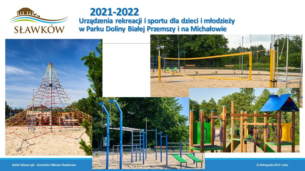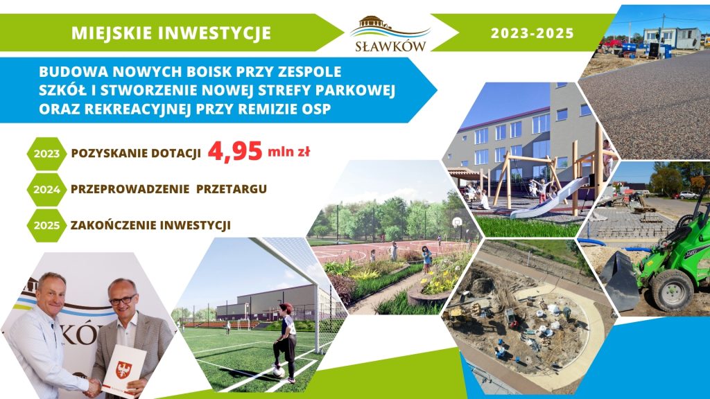 Budowa nowych boisk przy Zespole Szkół i stworzenie nowej strefy parkowej oraz rekreacyjnej przy remizie Ochotniczej Straży Pożarnej w Sławkowie.