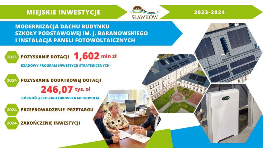 Modernizacja dachu budynku Szkoły Podstawowej im. Jana Baranowskiego w Sławkowie i instalacja paneli fotowoltaicznych.