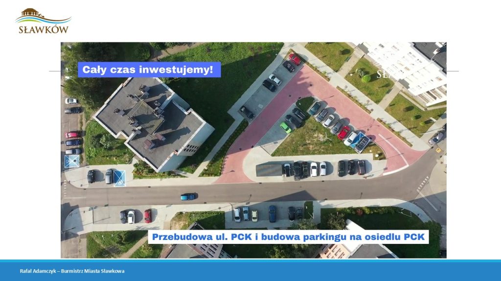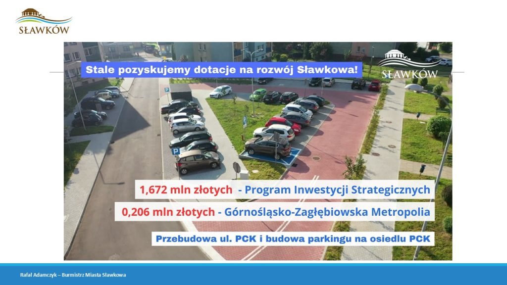 Rozbudowa drogowej infrastruktury w centrum Sławkowa przez modernizację odcinka ulicy na osiedlu PCK razem z budową parkingu.